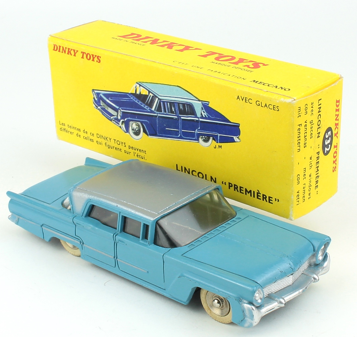 French Dinky 532 Lincoln 'Premiere'. Very near mint/boxed. Rare version in MID BLUE, with a SILVER ROOF, and CONCAVE WHEELS. Nice box. From The Island Collection.