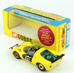 Corgi 344 Ferrari 206 Dino Sport. Very near mint/boxed. Yellow with RED SPOT WHEELS. From The Berlin Collection.