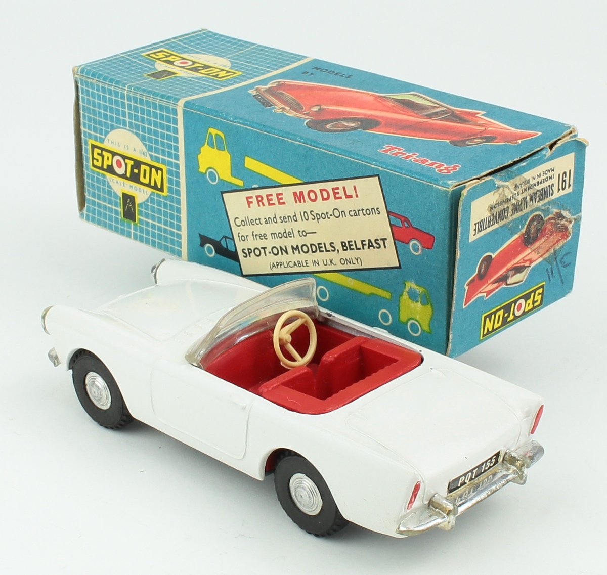 Spot-on 191 Sunbeam Alpine Convertible. Glacier white , red interior. Very near mint/boxed. From A Phenomenal Collection. Starting bid £175. Please note that QDT apply 12.5% buyer's commission.