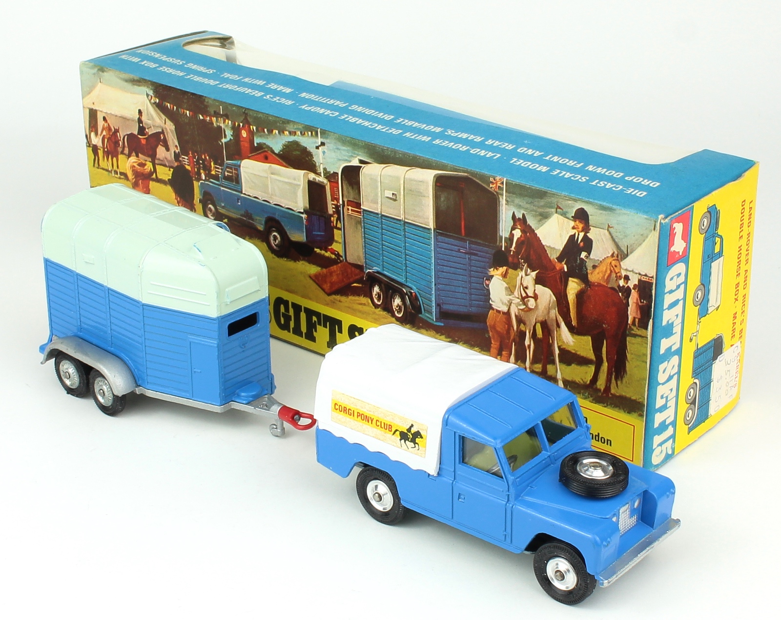 1) Corgi 438 Land Rover in bright mid-blue finish with a white detachable plastic canopy. Complete ‘Corgi Pony Club’ labels on both sides (light age wear). Shaped spun wheels with suspension. Late nylon tyres with ‘Corgi Toys’ embossed. Tiniest dot or two to the paint finish.