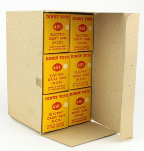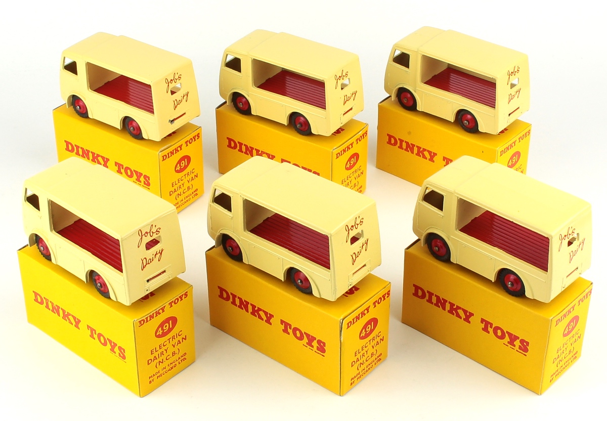 Old shop Trade Pack containing all six original Dinky 491 Electric Dairy Vans "Job's Dairy". Very near mint- very, very near mint/boxed. Rare promotional Dinky models. Exceptional unsold item with super-crisp boxes.
