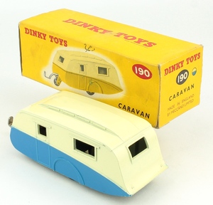 Dinky Toys 190 Caravan. Mid-blue & GREENISH-CREAM version. Very near mint/boxed (picture version) with card packing ring. From The West Midlands Collection. Starting bid £75. Please note that QDT apply 12.5% buyer's commission.