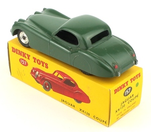 Jaguar XK120 Coupe by Dinky Toys, No. 157. Grey-green issue. Very near mint/boxed. Scarce spun wheel version. Super-fresh box! From The 25 Year Collection in California.