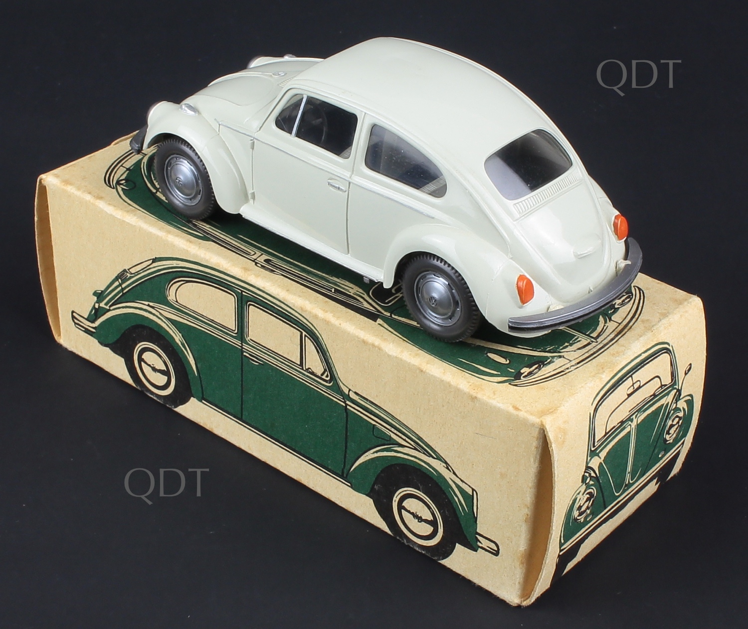 Another superb old shop stock quality item, this plastic VW Beetle model has a distinctive oyster colour finish, pale grey seating, deep grey steering wheel, window glazing.