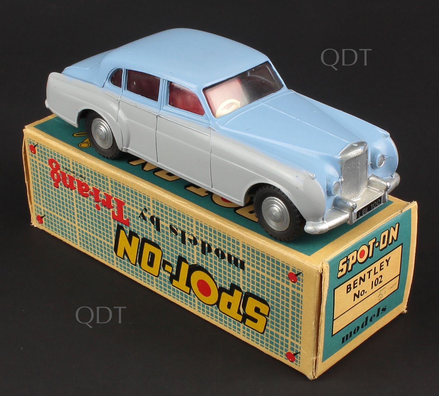 Bentley Saloon by Spot-on Models, No. 102. Powder blue & grey, with red interior. Very near mint/boxed. From The Heart of England Collection. QDT starting bid £250. Please note that QDT apply 12.5% buyer's commission.