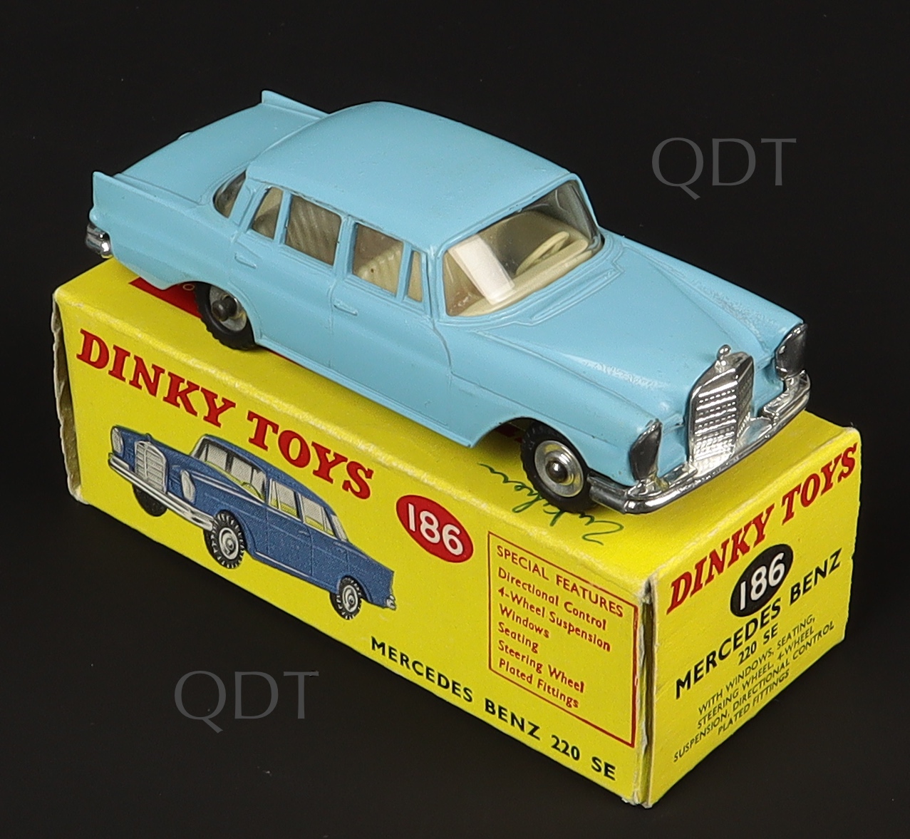 Mercedes Benz 220 SE by Dinky Toys, No. 186. Light blue, pale grey interior. Scarce. Very near mint/boxed. From The Berlin Collection.