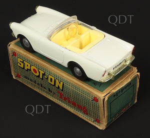 Issued during 1963 by the respected Spot-on manufacturer in strictly 1:42 scale. This Sunbeam Alpine Convertible model is finished in glacier white with a deep cream interior, including the steering wheel. Shiny spun wheels, and well-shaped original tyres (little surface splitting to one).