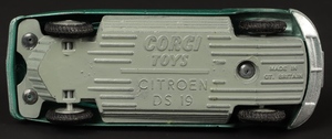 Citroen D.S. 19 by Corgi Toys, No. 210. Metallic green & black version - a rare find WITHOUT the mechanical 'bulge' on the base. Very near mint/boxed.From The West Midlands Collection.