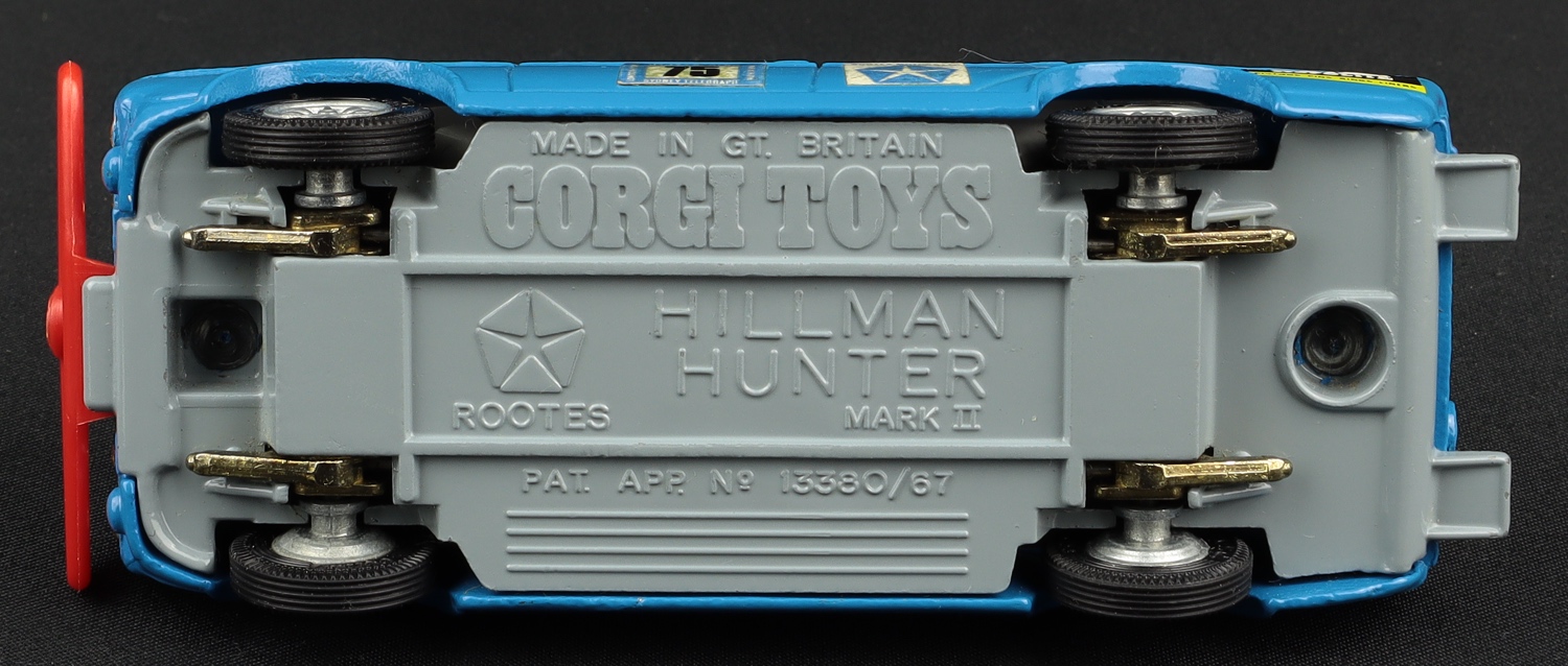 Hillman Hunter Rally Car With Kangaroo by Corgi Toys, No. 302. Version with 'GOLDEN' Golden Jacks. Very near mint/boxed. With leaflet. 2nd issue box version WITHOUT 302 printed on box face etc. From Christoph's Collection.