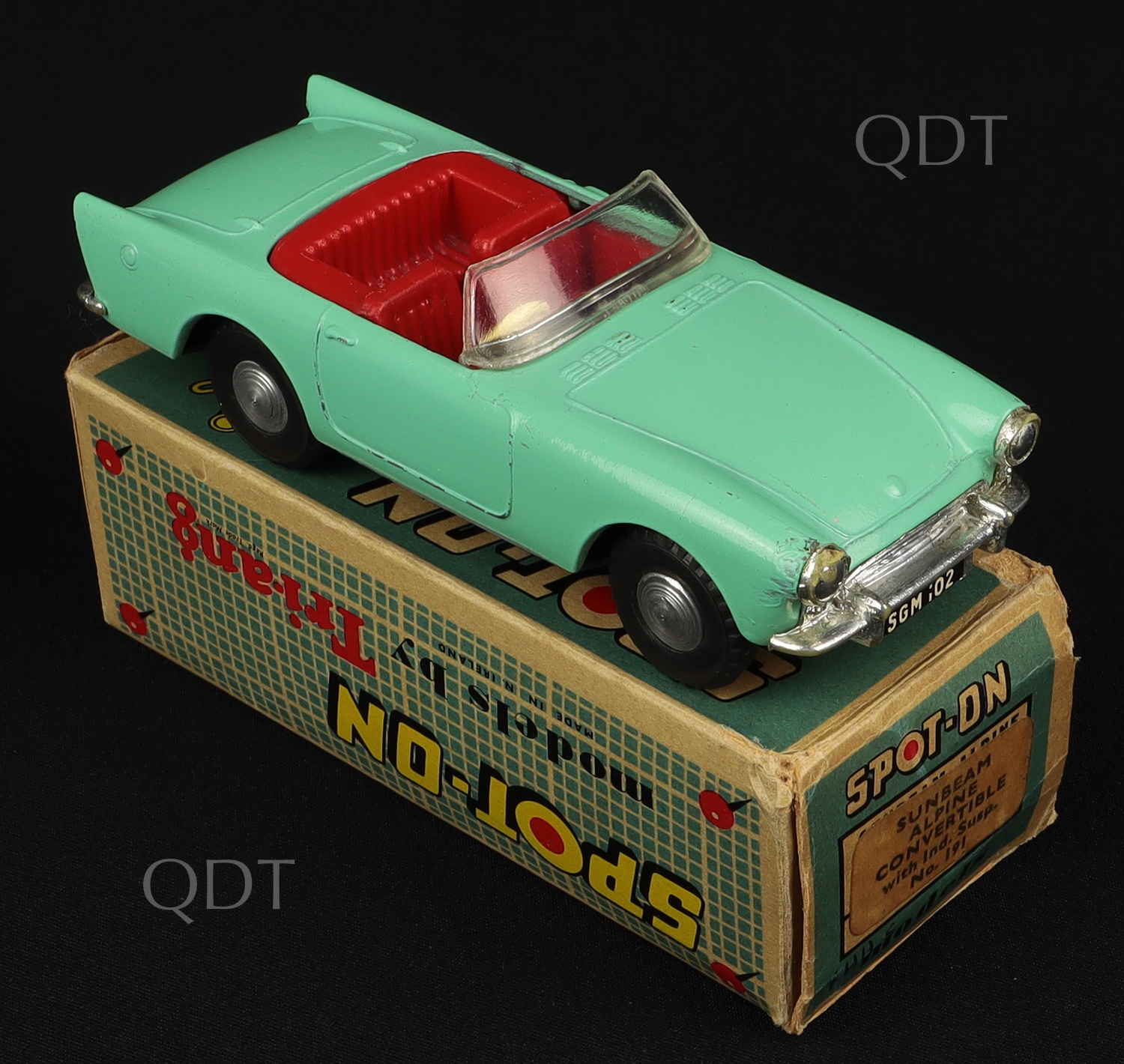 Sunbeam Alpine Convertible by Spot-on Models, No. 191. Scarce MINT-GREEN issue. Near mint plus/boxed. From The Rickman Collection. QDT starting bid £200. Please note that QDT apply 12.5% buyer's commission.