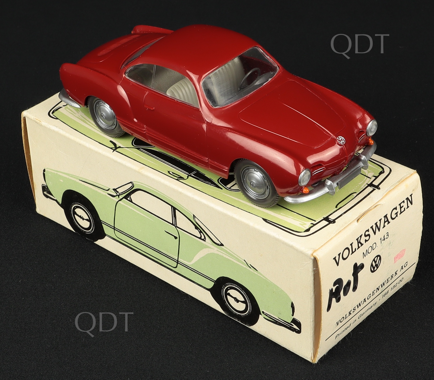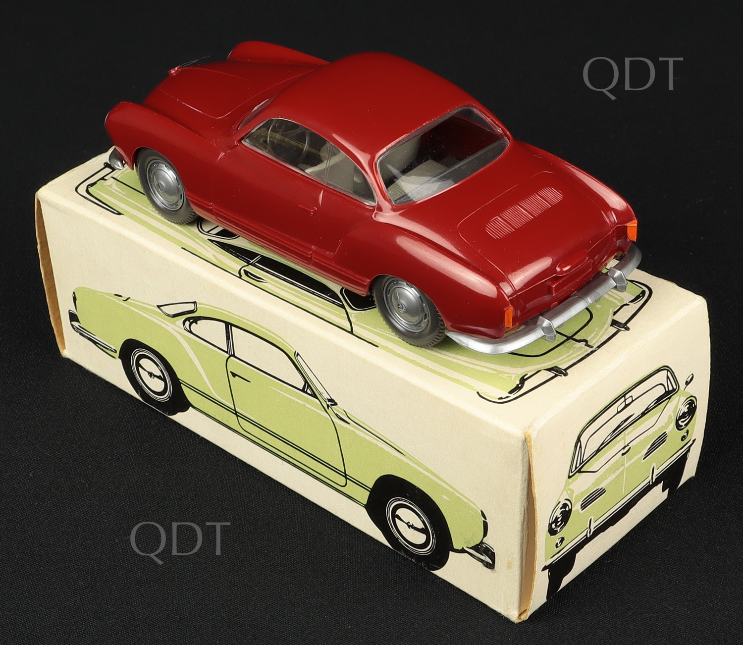Superb old shop stock quality item, this plastic Karmann Ghia model has a rich deep red finish, grey seating, deep grey steering wheel, window glazing.