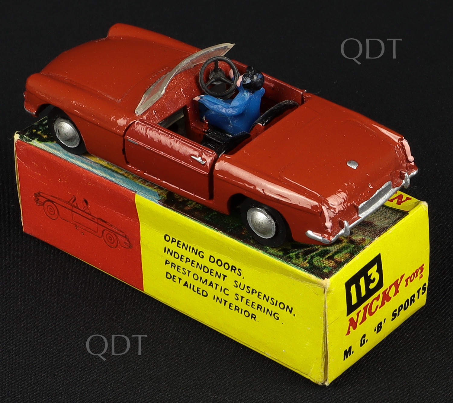 MGB Sports by Nicky/Dinky Toys, No. 113. A rare find in BRICK RED . Another First for QDT! Very near mint/boxed. Scarce version from The Berlin Collection.