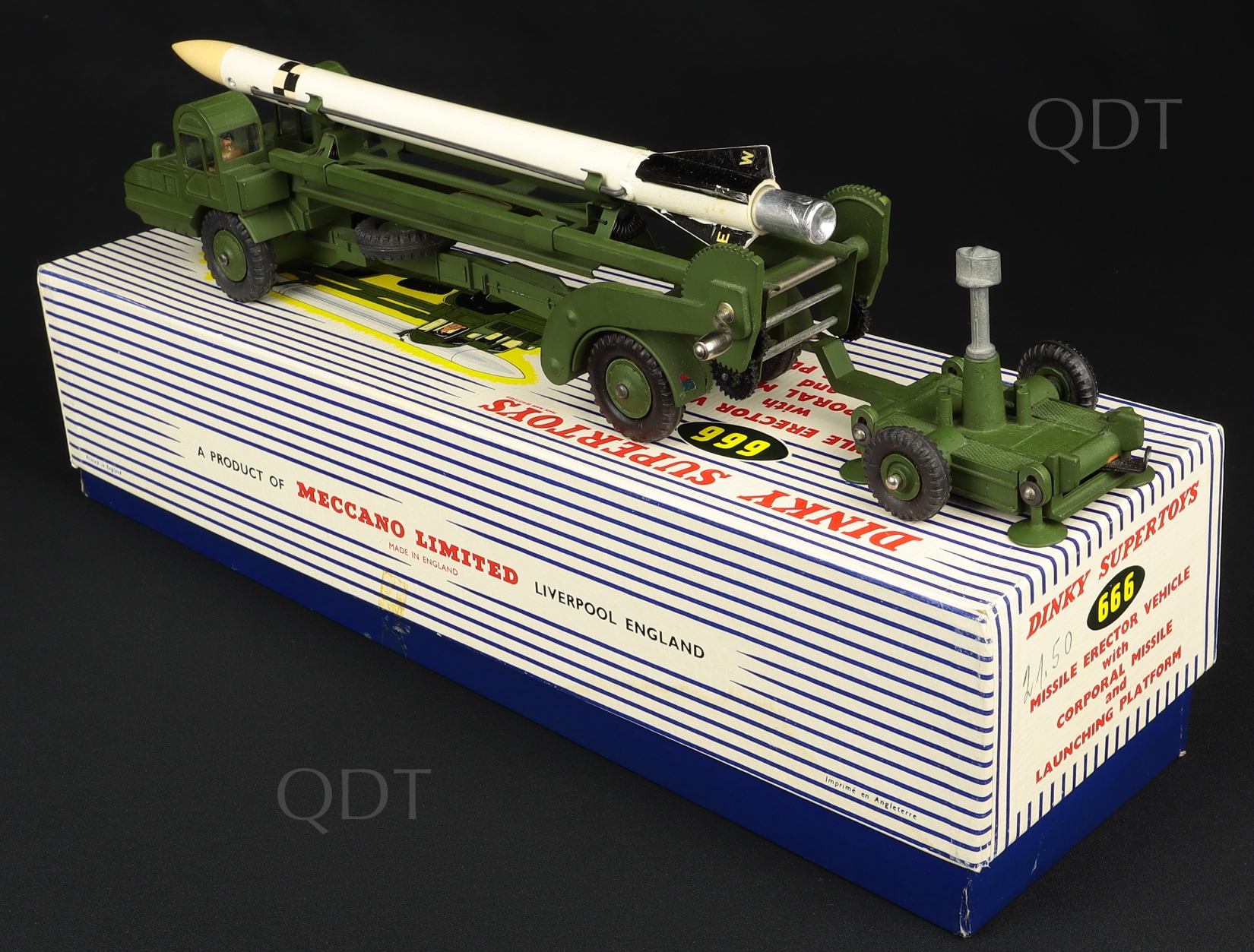 Missile Erecting Vehicle with Corporal Missile & Launching Platform by Dinky Toys, No. 666. Very near mint- very, very near/boxed. Fully functioning plastic cog version. With Instruction leaflet, Dinky Quality Control Tag, upper and lower packing pieces. From The Berlin Collection.
