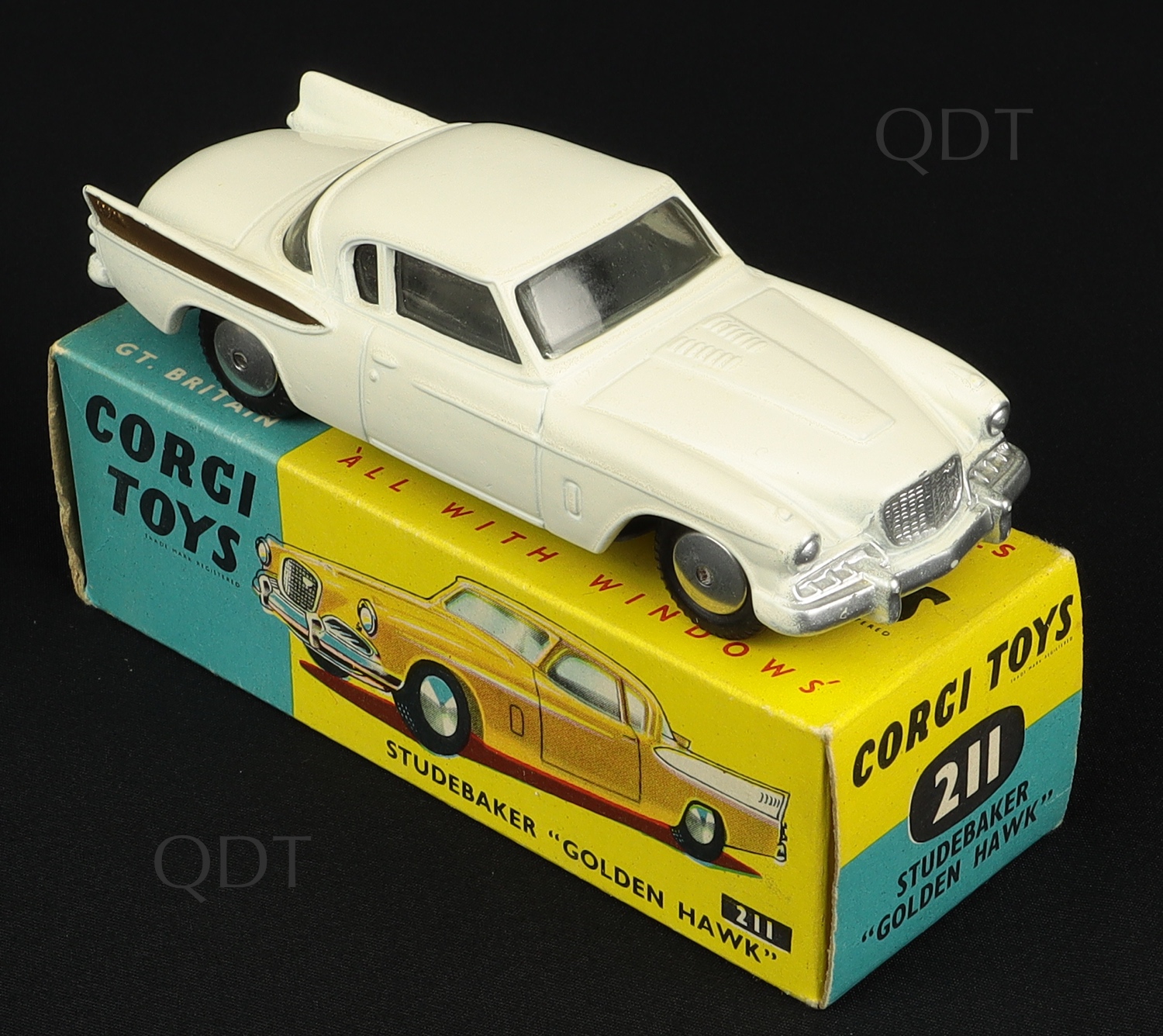 Studebaker Golden Hawk by Corgi Toys, No. 211. Very, very near mint/boxed. Scarce NON-SUSPENSION version in the blue and yellow picture box. From The Berlin Collection.