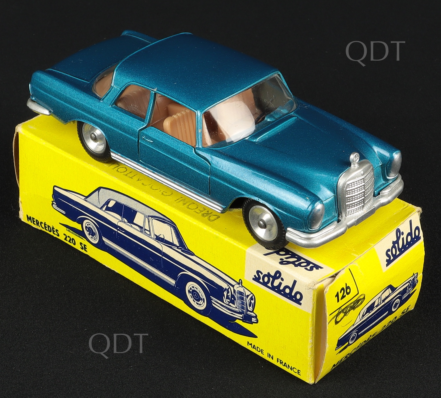 Mercedes 220 SE by Solido Models, No. 126. Mid-metallic blue issue. Very near mint/boxed. From The QDT Vault. Starting bid £125. Please note that QDT apply 12.5% buyer's commission.