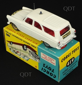 Ford Zephyr Motorway Patrol by Corgi Toys, No. 419. Very, very near mint/boxed, with card packing. Transition issue in GLOSS WHITE but EARLY ROOF LIGHT & FLAT SPUN WHEELS. From The Berlin Collection.