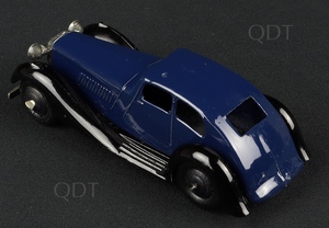 This classic Rover model has an appealing shining deep blue and black finish. Black ridged wheels and smooth black tyres. Detailed cast chassis is shiny. Made between 1948-50. Intact and complete radiator, headlight and bumper assembly.