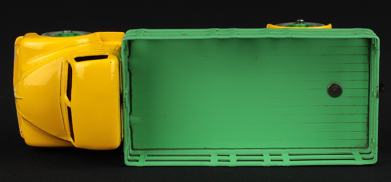 This scarce late rivetted issue is finished in yellow with a pale green back and mid green hubs. Well-shaped grey tyres. Harder version to find. This Leyland Comet Lorry model presents very well.