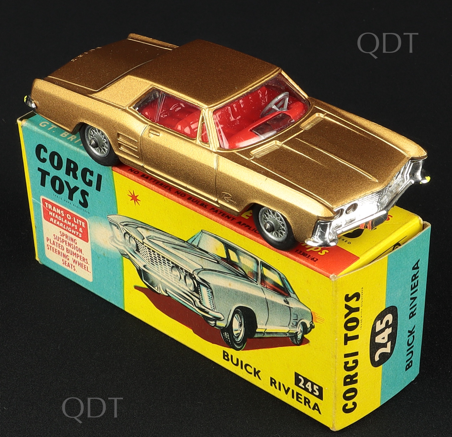 Buick Riviera by Corgi Toys, No. 245. Gold issue, spoked wheels. Very near mint/boxed, with model specific leaflet. From The Berlin Collection.