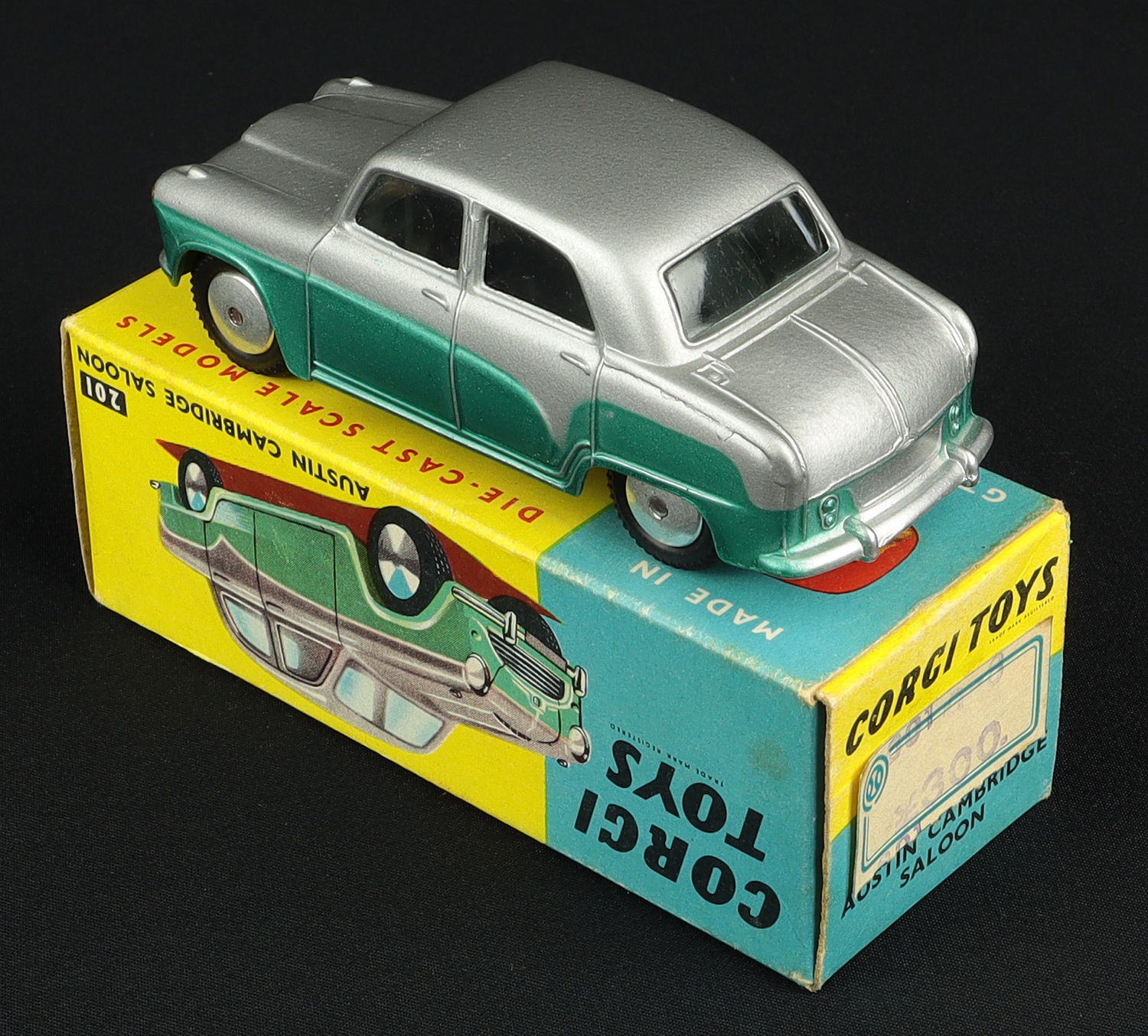 Austin Cambridge Saloon by Corgi Toys, No. 201. Very near mint/boxed. Rarest version in SILVER-GREY & METALLIC GREEN. From The Hastings Collection.