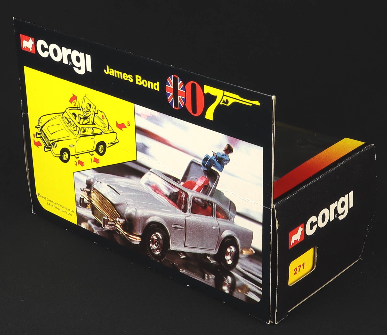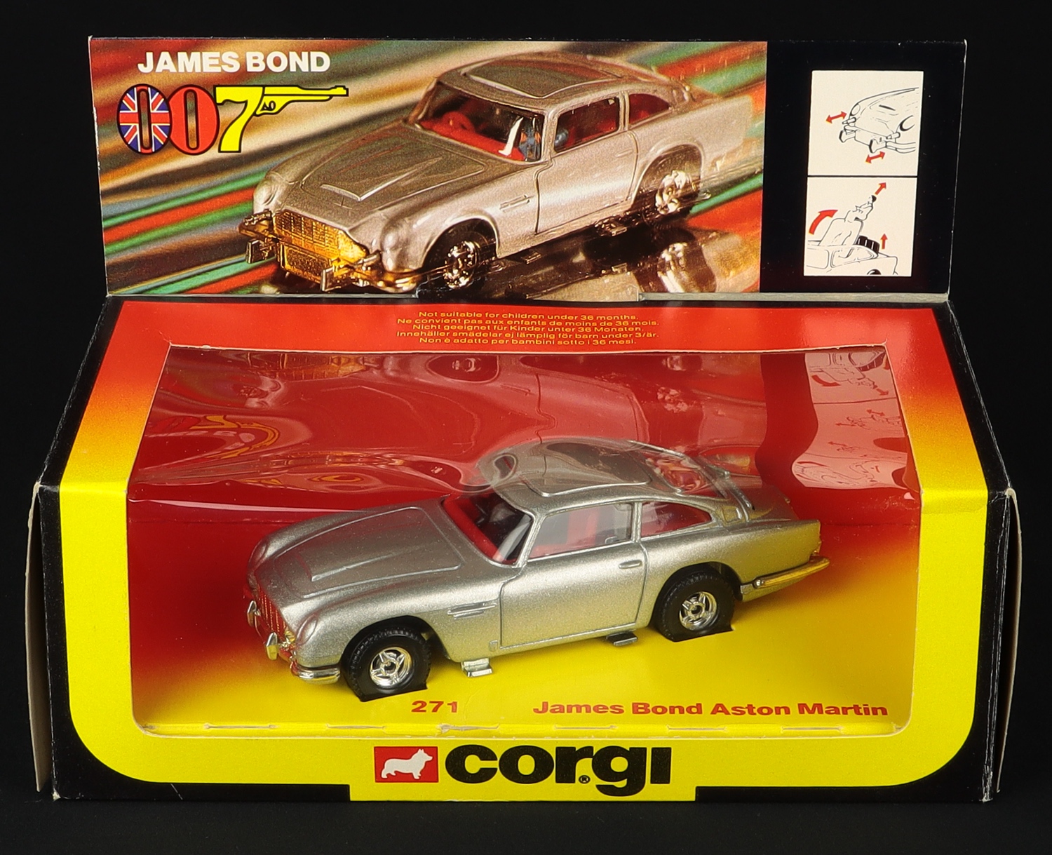 James Bond Aston Martin by Corgi Toys, No. 271. A scarce find with glittering silver finish & 4-spoke wheels. Red interior. Very , very near mint/boxed (detachable header card version). Starting bid £150. Please note that QDT apply 12.5% buyer's commission.