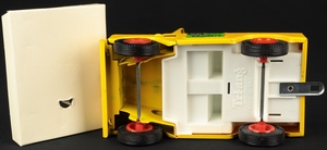 A bright and colourful two-piece set composed of pressed steel and plastic. In original condition, this pairing measures approx. 29.5cms. Complete bright labels on both sides of the vivid yellow Land Rover. White plastic detailed interior including steering wheel and gear stick. Red plastic wheels (usual reaction to the tyres), and well-shaped black plastic tyres. Windscreen folds flat. Shiny towing attachment. Green plastic canopy.