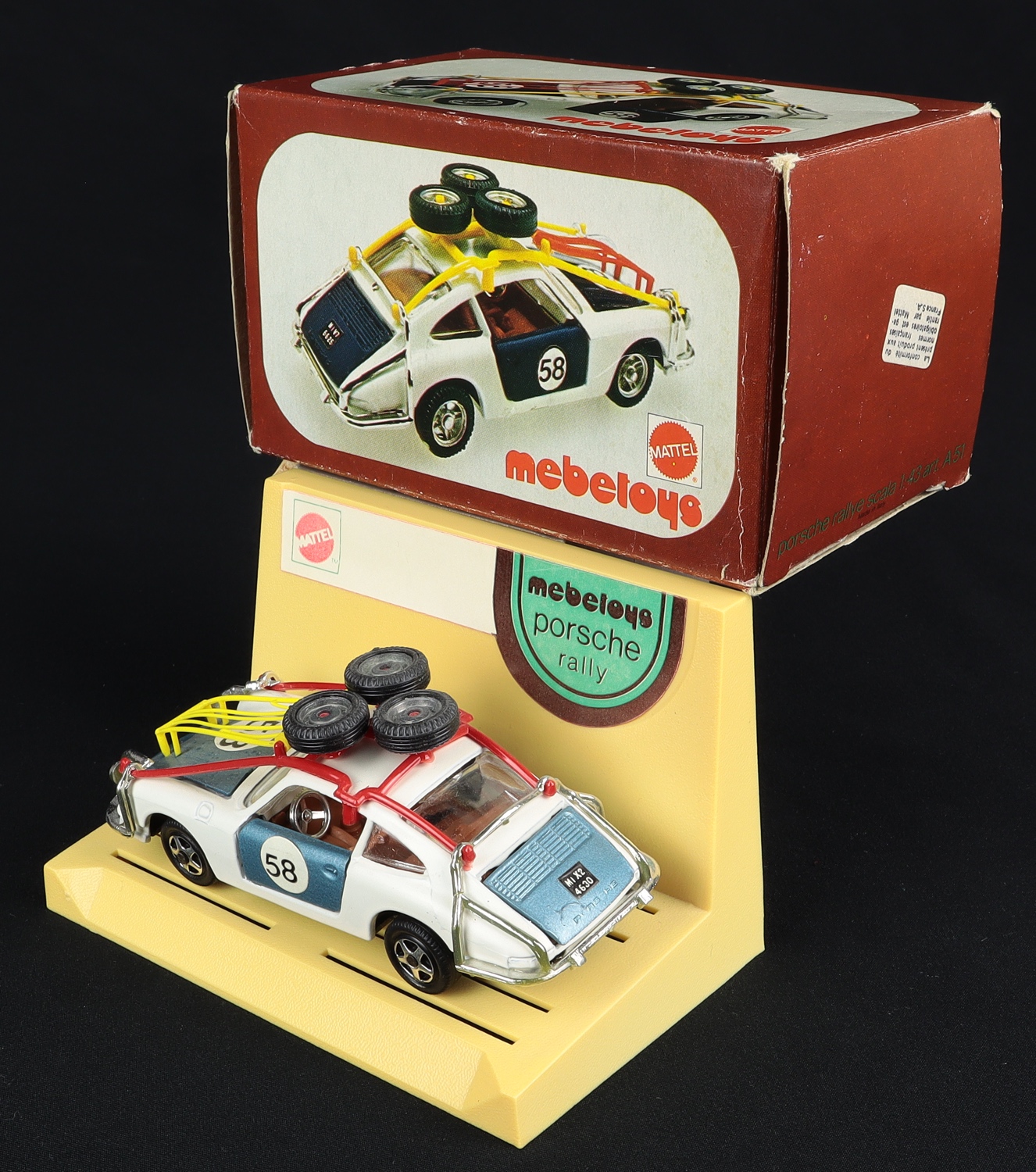 Does not appear to have been removed from its complete and clean plastic plinth with ‘Mattel Mebetoys Porsche Rally’ labels. Little factory smudge of the silver-blue paint on one side wing.