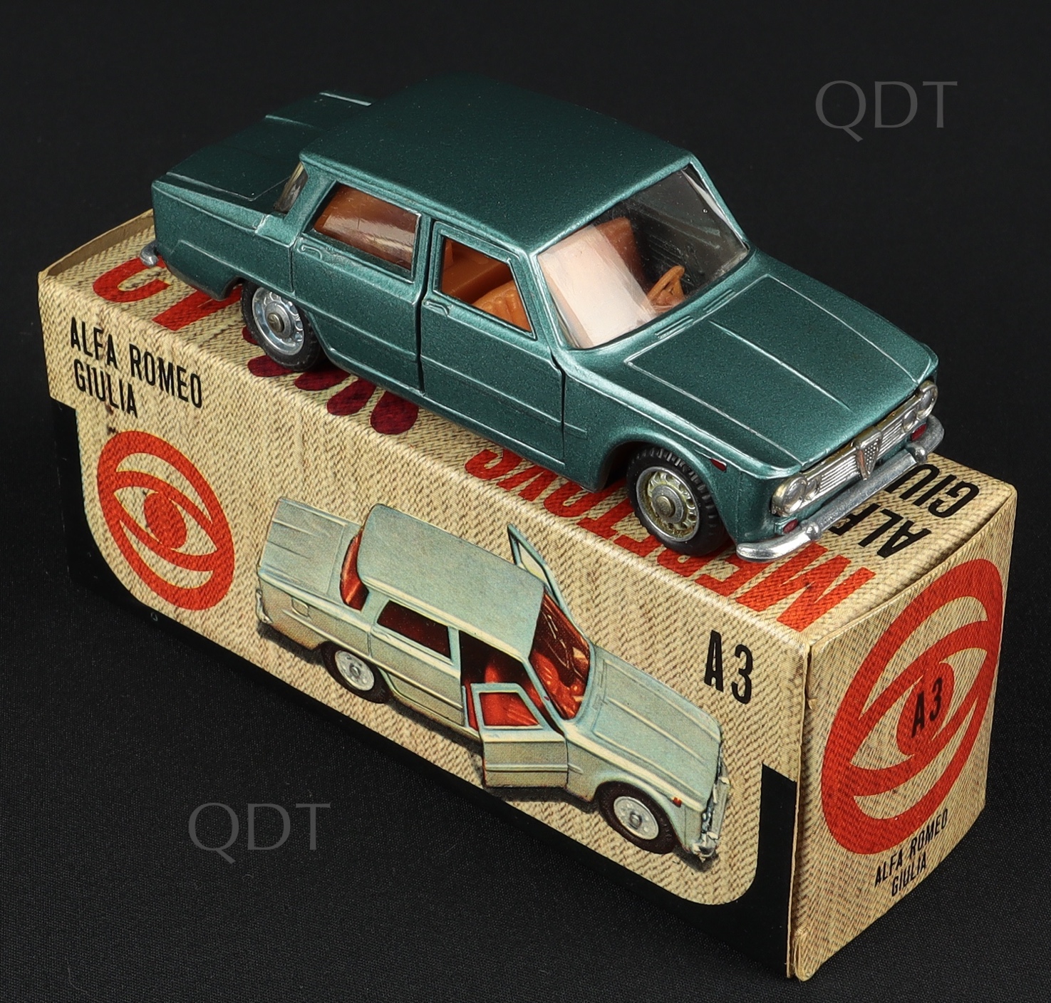 Alfa Romeo Giulia by Mebetoys Models A3. Metallic sea-green, tan interior. Very near mint/boxed, with packing foam. Scarce - and a First for QDT! From The Berlin Collection.