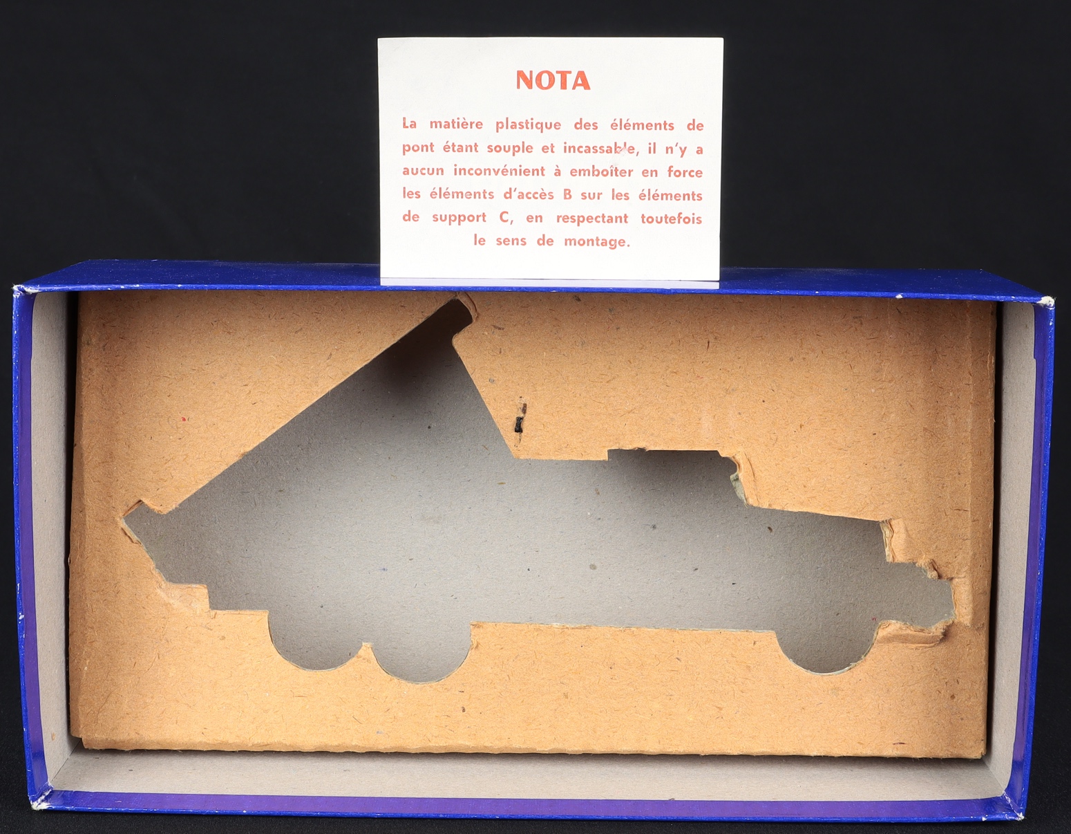 Brockway Bridge Layer by French Dinky Toys, No. 884. Very near mint/boxed, with card packing. Includes all bridge components and Map with Instructions on reverse and Nota (note) from Dinky. Very fine! From The Berlin Collection.
