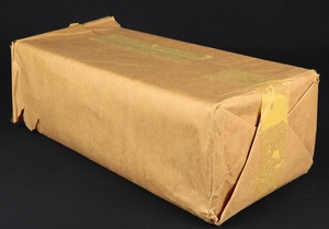 The colourfully illustrated card lift-of lid box is a delight! The unmistakable Sean Connery is behind the wheel of the car. Tiniest wear only. Polystyrene packing piece is included. Box is dated 1965.