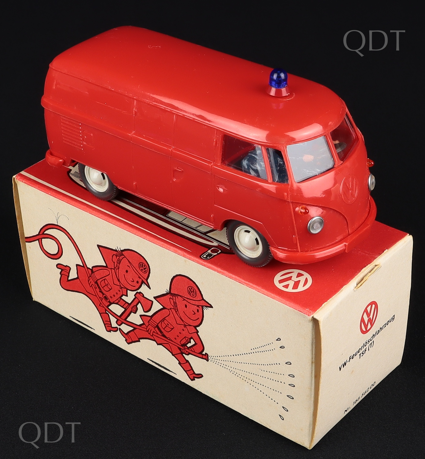 Superb old shop stock quality item, this plastic VW Transit Van ‘FIRE’ model has a blue roof light, two seated figures, beige colour wheels, window glazing.