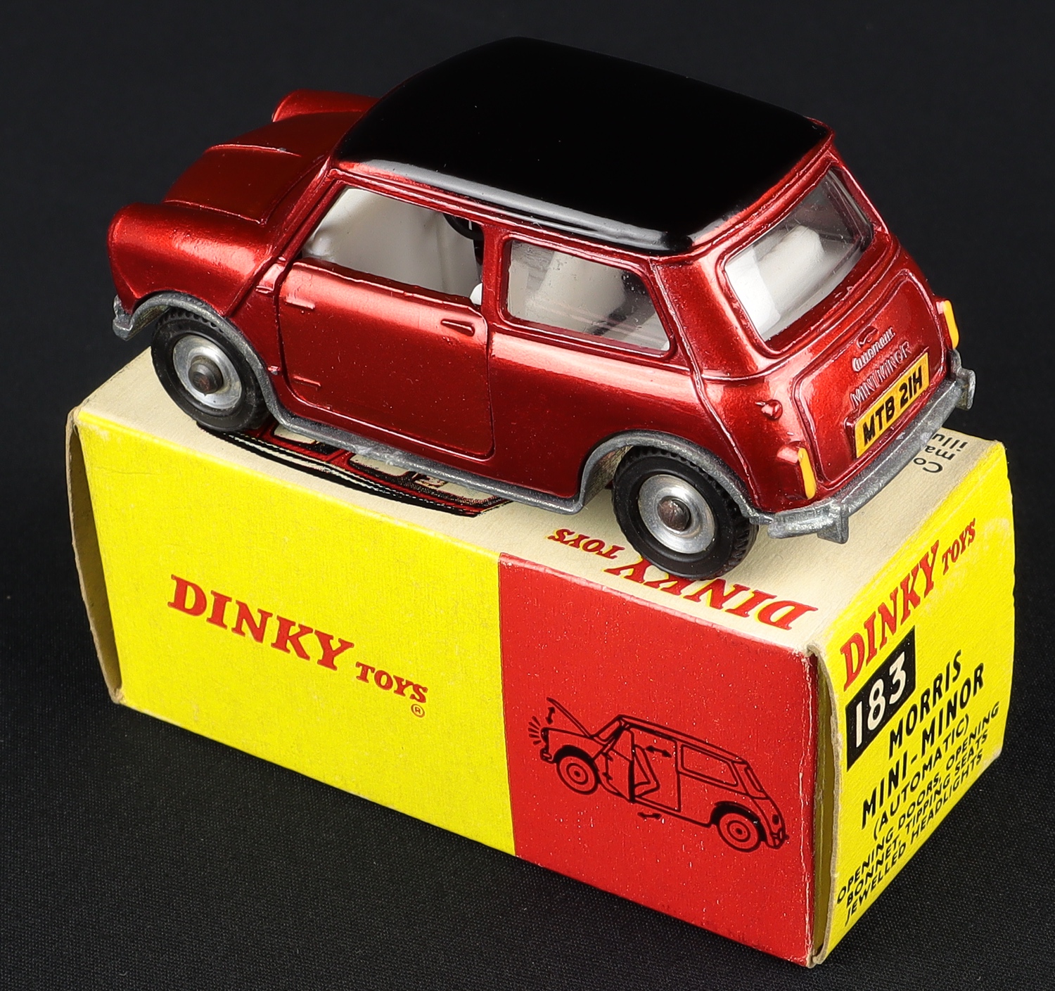 Morris Mini-Minor (Automatic) by Dinky Toys, no. 183. Very near mint/boxed. A First for QDT in METALLIC RED with GLOSS black roof & cast bonnet detail. SPUN wheels. Scarce. In picture box with white background. From The Berlin Collection. QDT starting bid £125. Please note that QDT apply 12.5% buyer's commission.