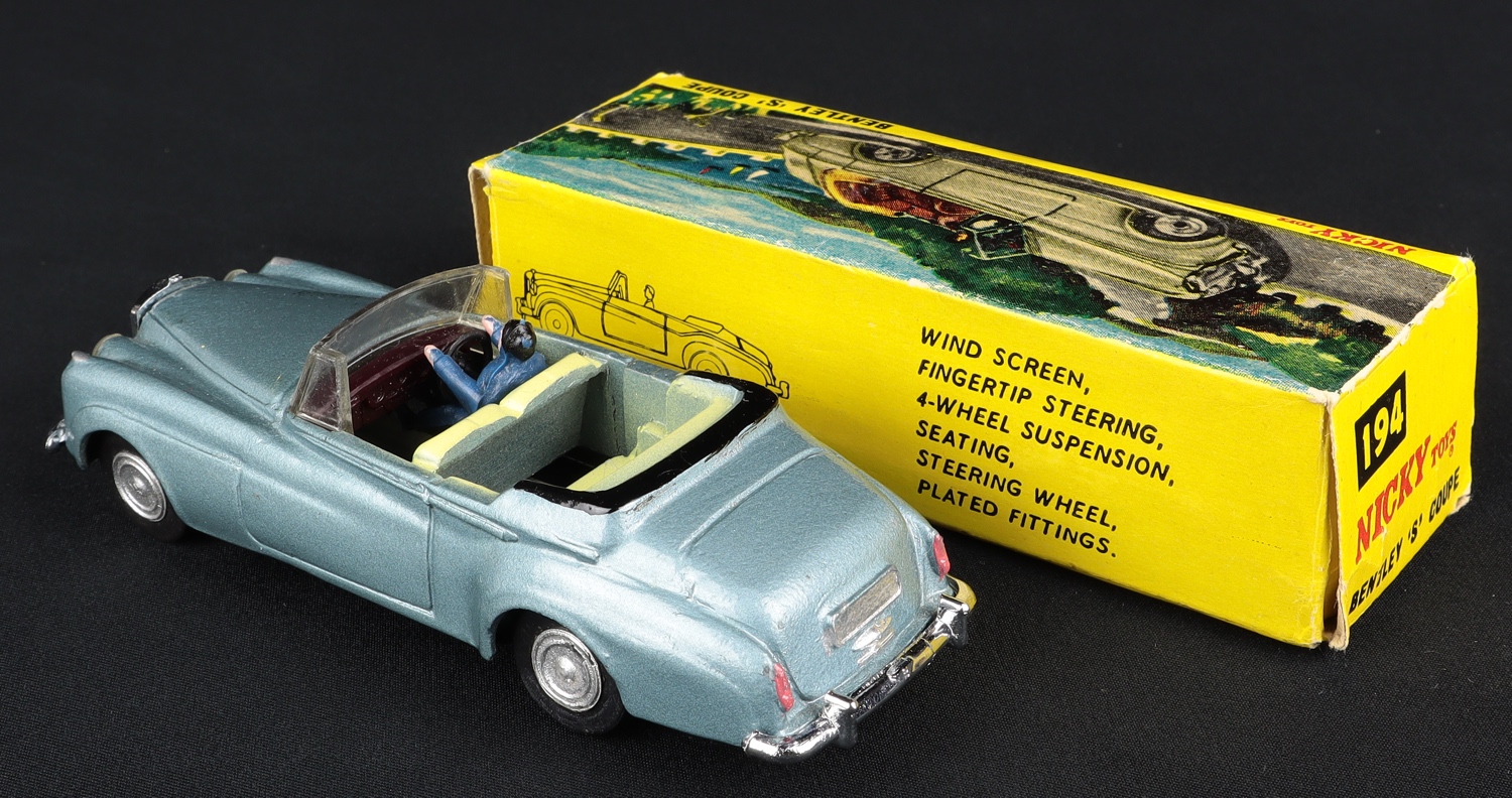 Bentley S Coupe by Nicky Dinky Toys, No. 194. Metallic LIGHT BLUE version, black tonneau, avocado seating, darkest purple dashboard. Very, very near mint/boxed, with driver. An exceptional find. From A Phenomenal Collection. Starting bid £200. Please note that QDT apply 12.5% buyer's commission.
