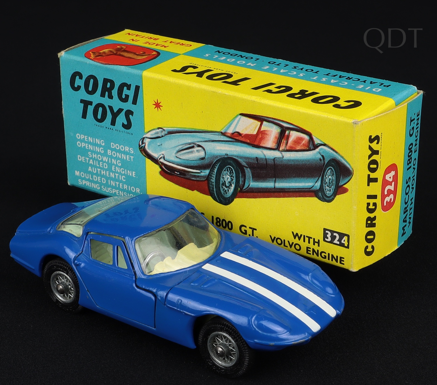 Marcos 1800 G.T. with Volvo engine by Corgi Toys, No. 324. Harder to find vivid mid-blue version with AVOCADO shade dashboard & light blue seating. Near mint plus/boxed. Fine box! From The Berlin Collection.