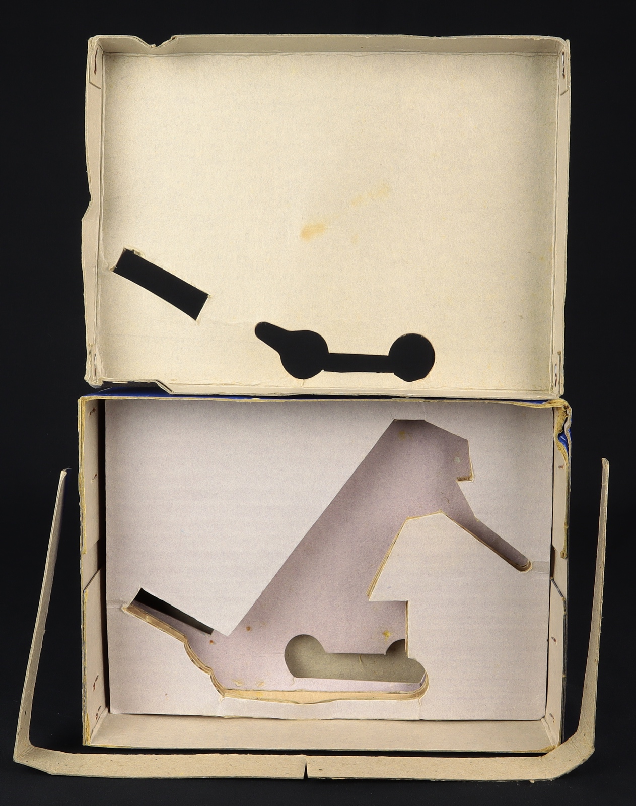 Hard to find box version has retained its colour vibrancy. Complete clean paper labels. Light wear includes a small storage crush. . All packing pieces are present i.e. four layers of shaped card and two card supports. Rare to find complete.