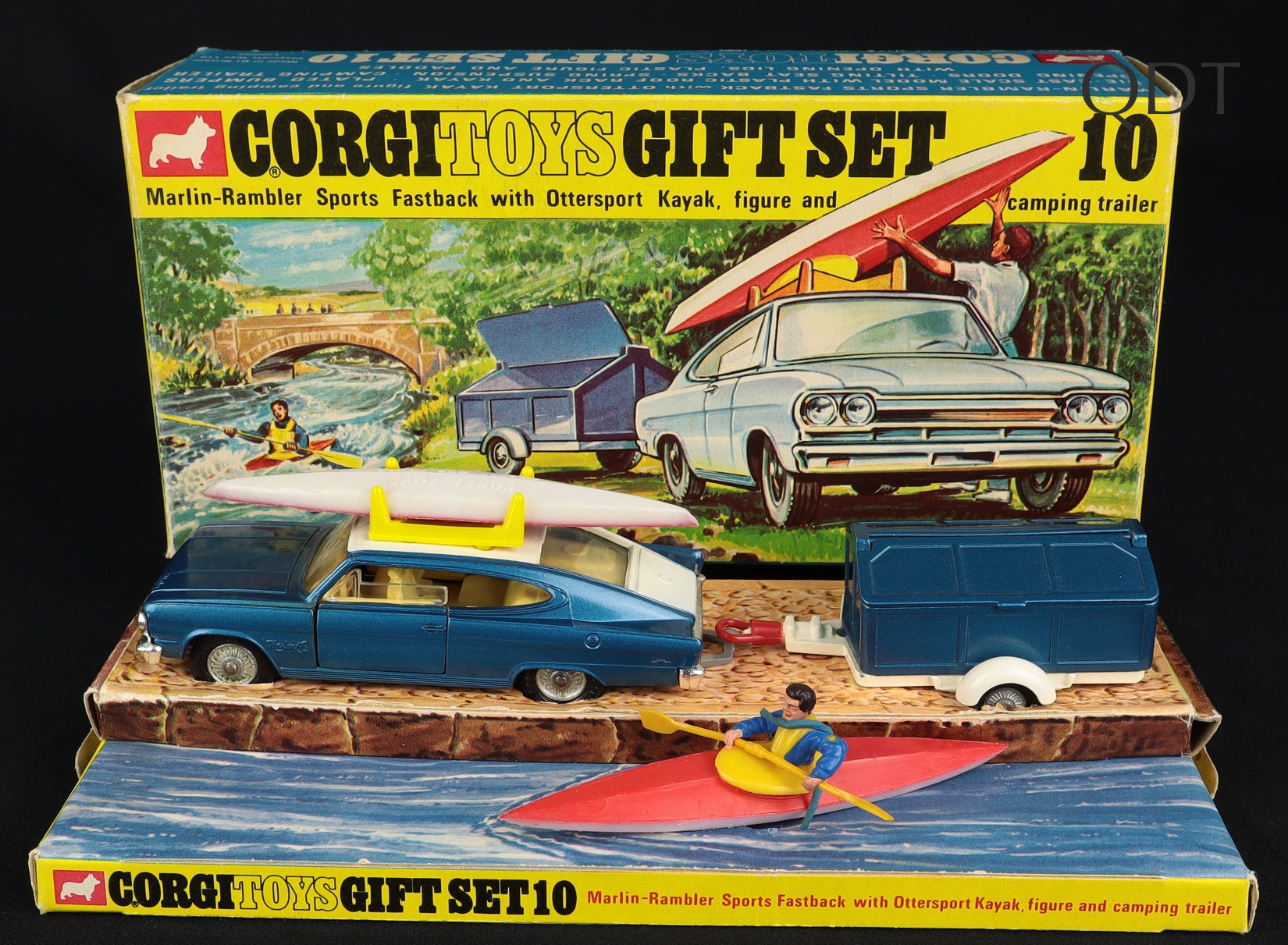 1) Corgi Marlin Rambler Sports Fastback in metallic mid-blue, white roof and boot, suspension on detailed cast wheels. Roof rack in place with red and white canoe atop. A scarce colour issue which only ever appeared in this gift set. Virtually mint condition with a notably intact grey tow bar.