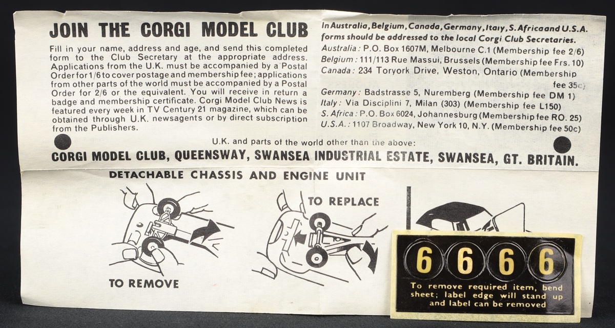 Lotus Elan Coupe by Corgi Toys, No. 319. Very near mint/boxed. Red & white version with DRIVER FIGURE & BOOT TRANSFER. Assumed factory sample piece. A rare model from The Valencia Distributor Collection. Starting bid £300. Please note that QDT apply 12.5% buyer's commission.