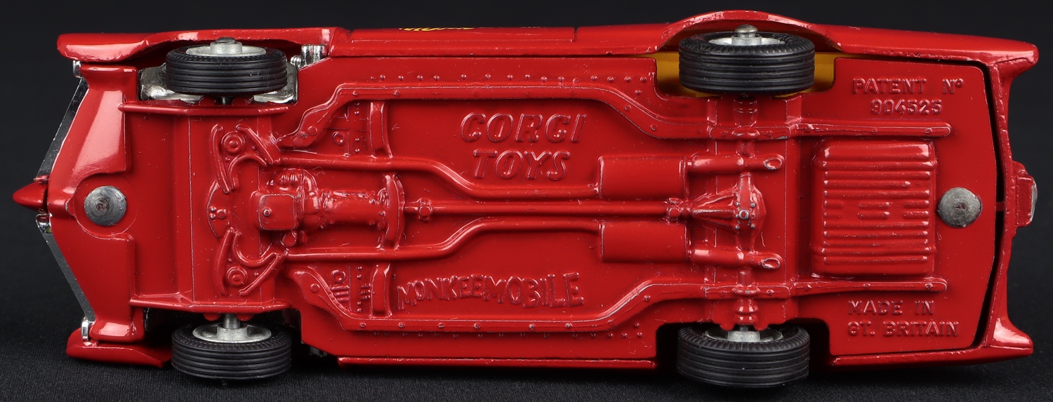 A bright and glossy example with a vivid red finish, white roof, detailed cast wheels, complete with all four figures inside. Suspension. Complete ‘Monkees’ transfers on both sides. Bright chrome engine detail.