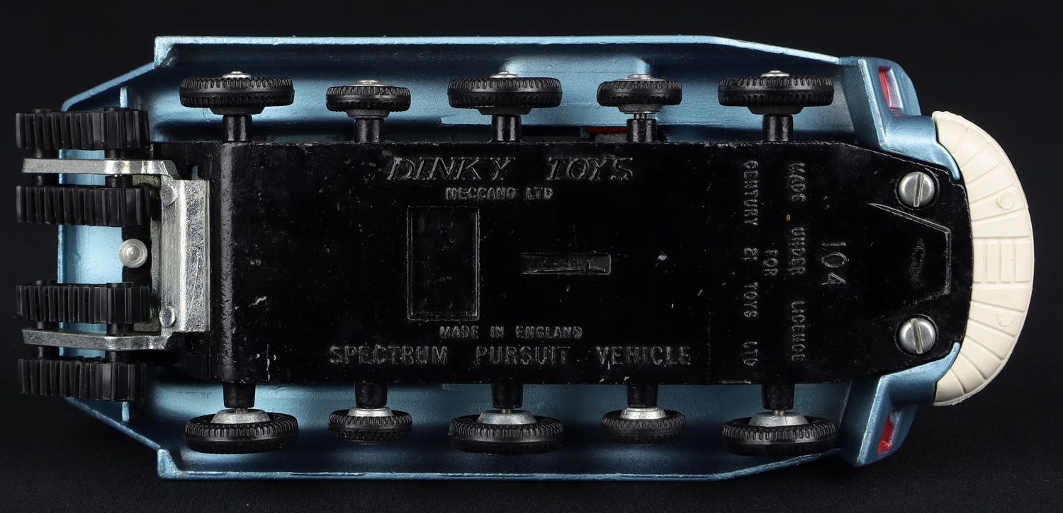 Spectrum Pursuit Vehicle by Dinky Toys, No. 104. Near mint plus/boxed. 2nd issue with white plastic cover on the door release mechanism on the roof & simplified Captain Scarlet mechanism. White bumper and black base. Scarce INTERIM Bubble pack box with BLANKED OUT section. With Leaflet. From The Berlin Collection.