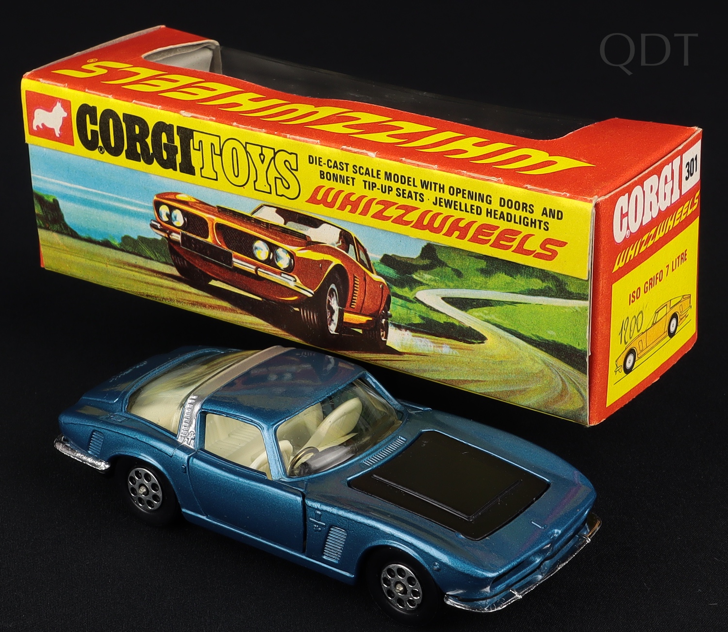 Iso Grifo 7 Litre by Corgi Toys, No. 301. Metallic blue with silver roll bar & cream interior. 'Pepperpot' whizzwheels. Very near mint/boxed. From The Berlin Collection.