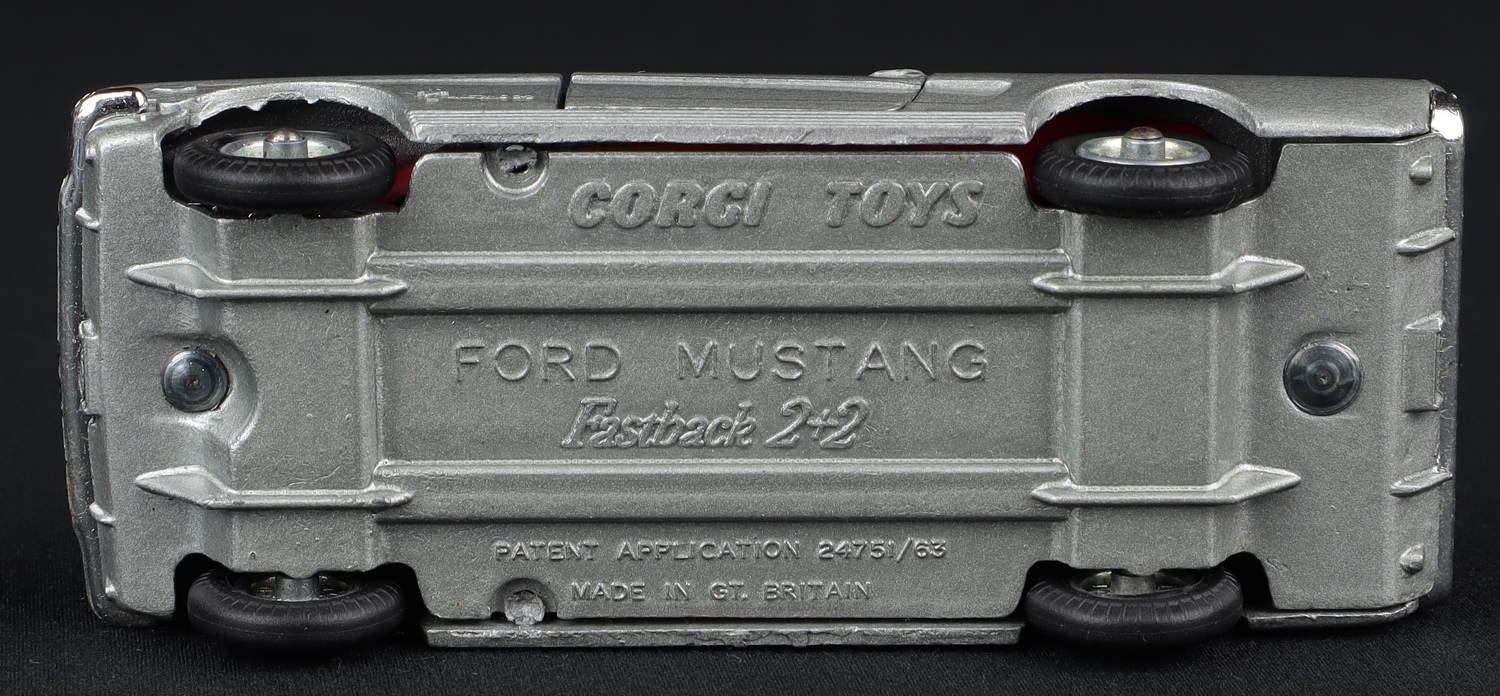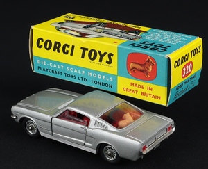 First issue from 1965, this Ford Mustang model has a silver finish, with a deep red detailed interior, and a Corgi dog reclining at the back. Opening doors and tilting seats. Jewelled headlights and a complete Mustang detailed radiator.