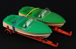 This Healey Sports Boat is finished in a distinctive sea-green and cream. Complete with intact screen and cream steering wheel. Early issue so the deep orange trailer has three black plastic treaded tyres (later issues would have just two). Bright metal parts.