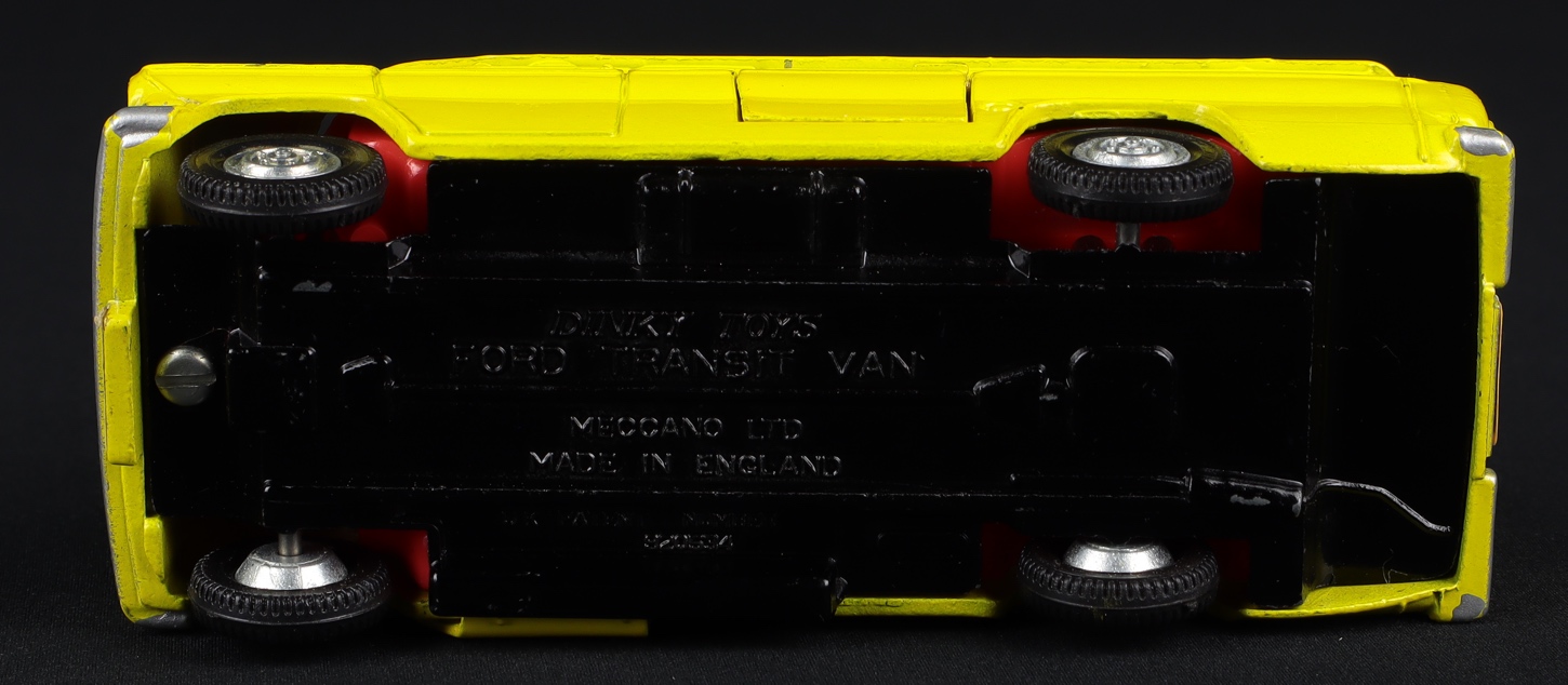 First issue (1966-69) in the range of transit vans produced by Dinky in various colour finishes and liveries. This example is in virtually mint condition in vivid deep yellow, with red interior, and a sliding side door, opening rear doors. Jewelled headlights. Black base. Complete ‘HERTZ TRUCK RENTAL’ labels on both sides and at the rear opening doors. Original ‘L’ registration plates front and rear. Shiny wheels. As-new original tyres. Silver trim.