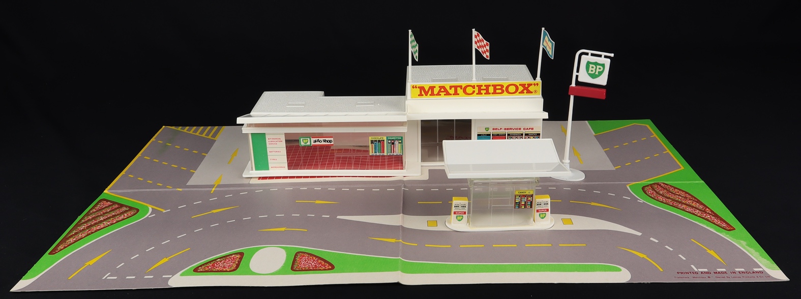 Dated 1970, this is a fine unused item with a pristine card forecourt, 2 white buildings (Self-Service Cafe & Auto Shop) ‘BP’ Sign, ‘MATCHBOX’ roof sign, and accessories.