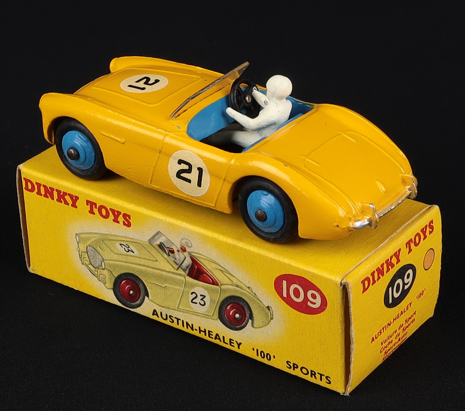 Austin-Healey '100' Sports by Dinky Toys, No. 109. Orange-yellow version. In original Dinky Shopkeeper's Trade Box. Dated 1957. Very near mint/boxed. From The Reference Collection.