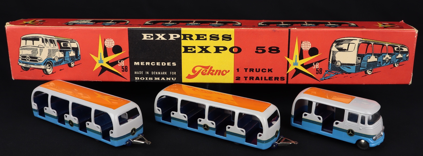 EXPO 58 Gift Set by Tekno Models, No. 851. Includes 852 Mercedes Truck & 2 x Tekno 853 Mercedes Trailers.Very near mint/boxed, with card packing. Rare set produced for 'Expo 58 Bois Manu'.