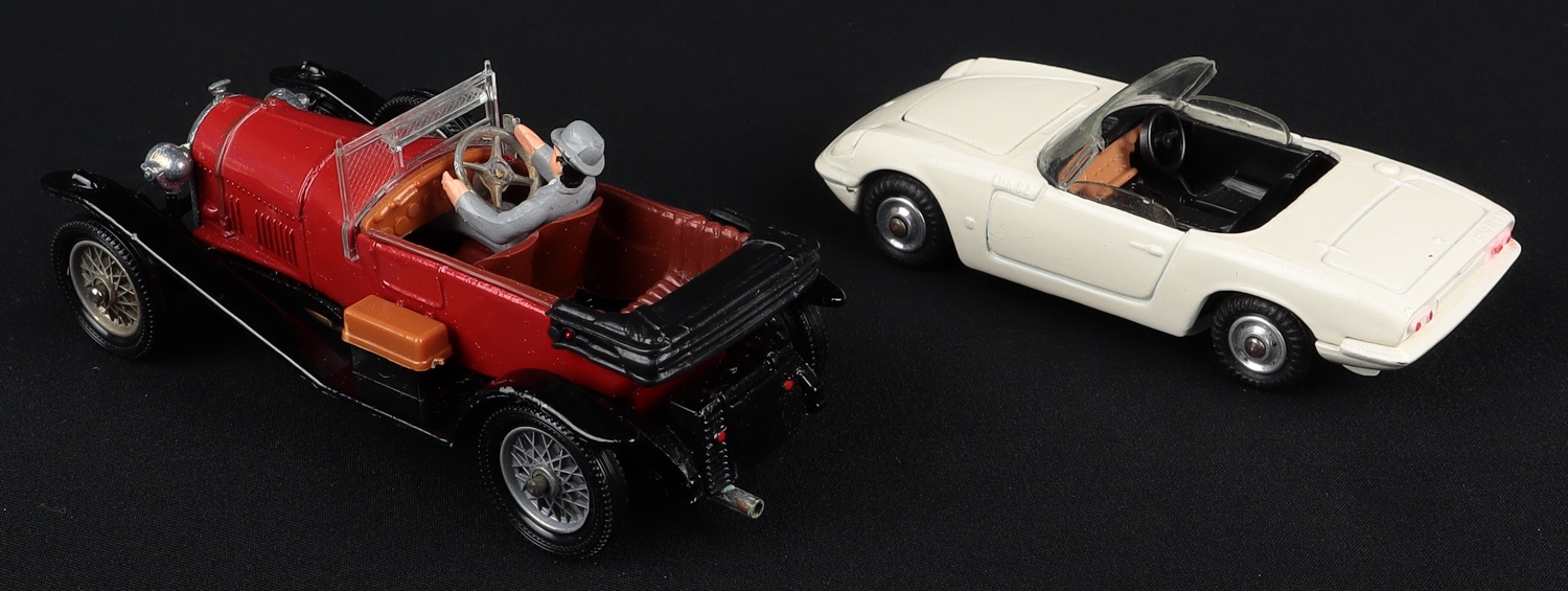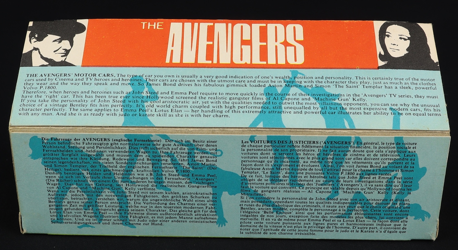 1) John Steed’s Bentley in red and black finish, complete with all parts, and including the figure of John Steed at the wheel. Very close to mint condition (few small marks to the running boards). Silver spoked wheels. Fine original tyres.
