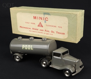 'POOL' Mechanical Horse & Fuel Oil Tanker by Minic Models, No. 79M. Clockwork. Very near mint/boxed. Very scarce WARTIME version. From The Denis Tyler Collection. QDT starting bid £500. Please note that QDT apply 12.5% buyer's commission.