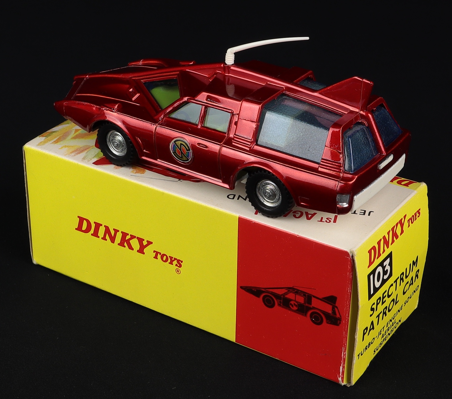 Spectrum Patrol Car by Dinky Toys, No. 103. Very near mint/boxed, with card packing piece & Leaflet. White painted base version. From The Ian Hewlett Collection. Starting bid £150. Please note that QDT apply 12.5% buyer's commission.
