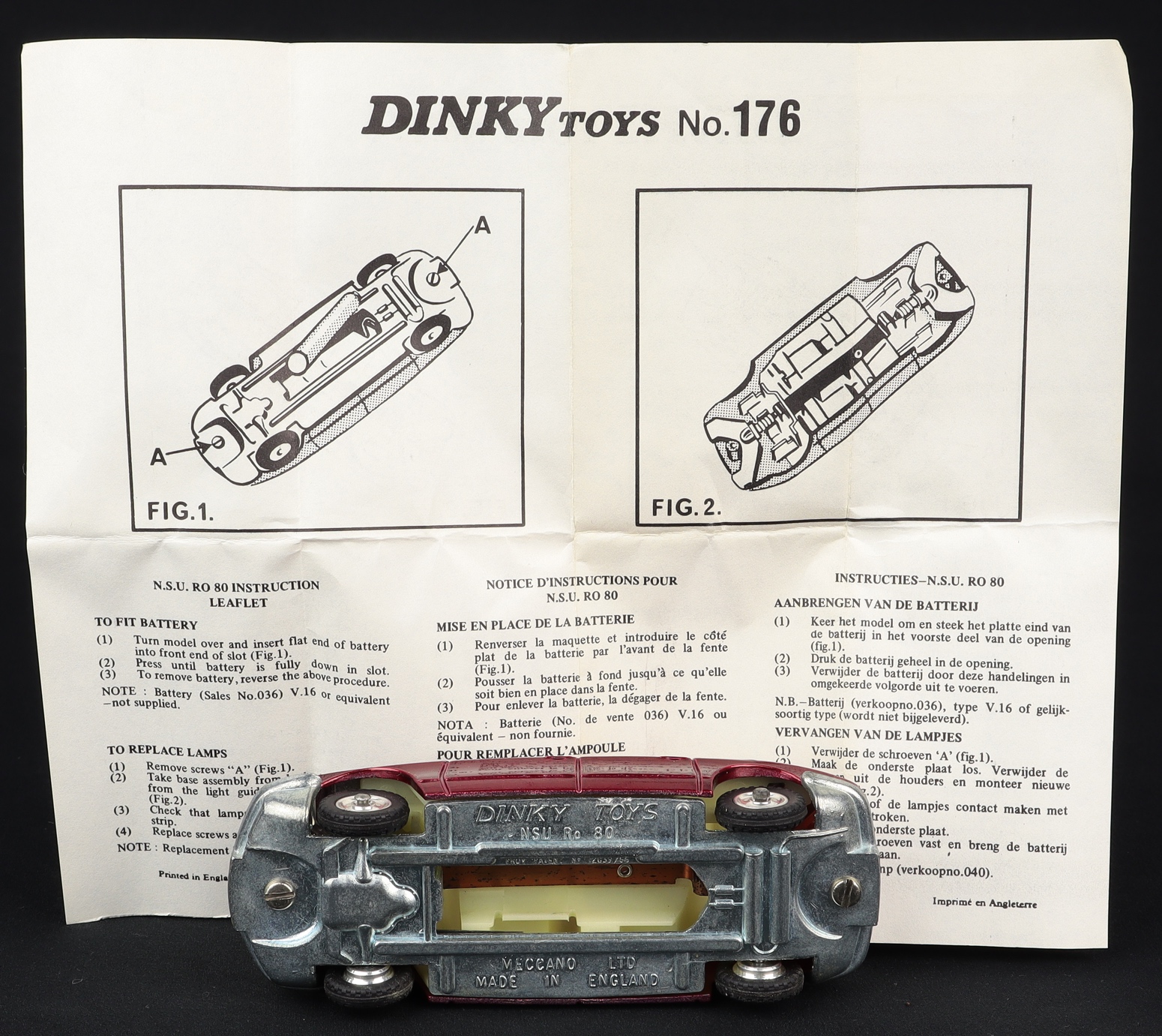N.S.U. Ro 80 by Dinky Toys, No. 176. Metallic red. With leaflet. Very near mint/boxed, with leaflet. From The Reference Collection.